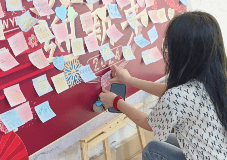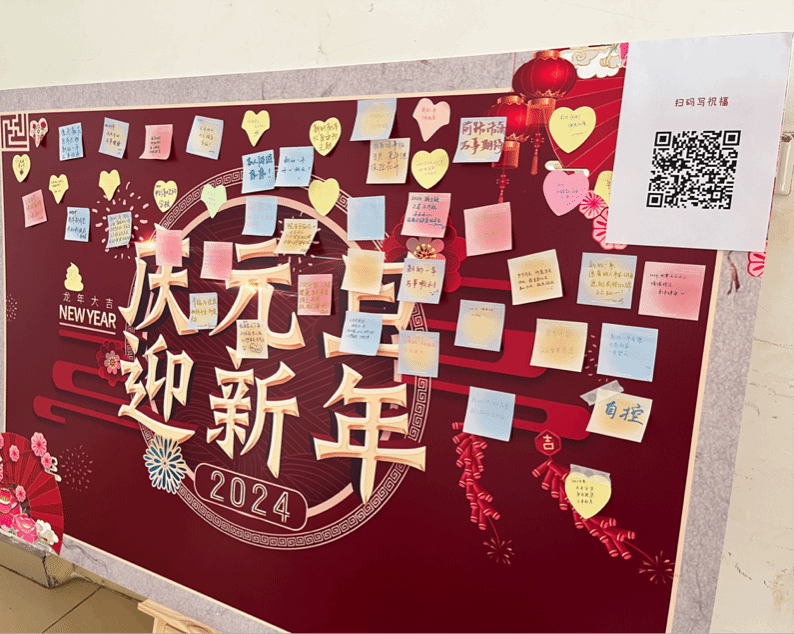 同学们纷纷在许愿卡上写下自己的新年愿望,郑重地贴在心愿墙上。有的同学祝愿自己学习进步,有的祝愿同学天天开心,还有的祝愿家庭幸福美满......小小的心愿墙承载了同学们满满的期望。