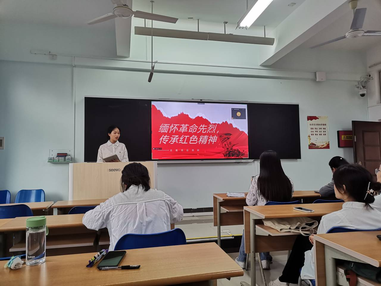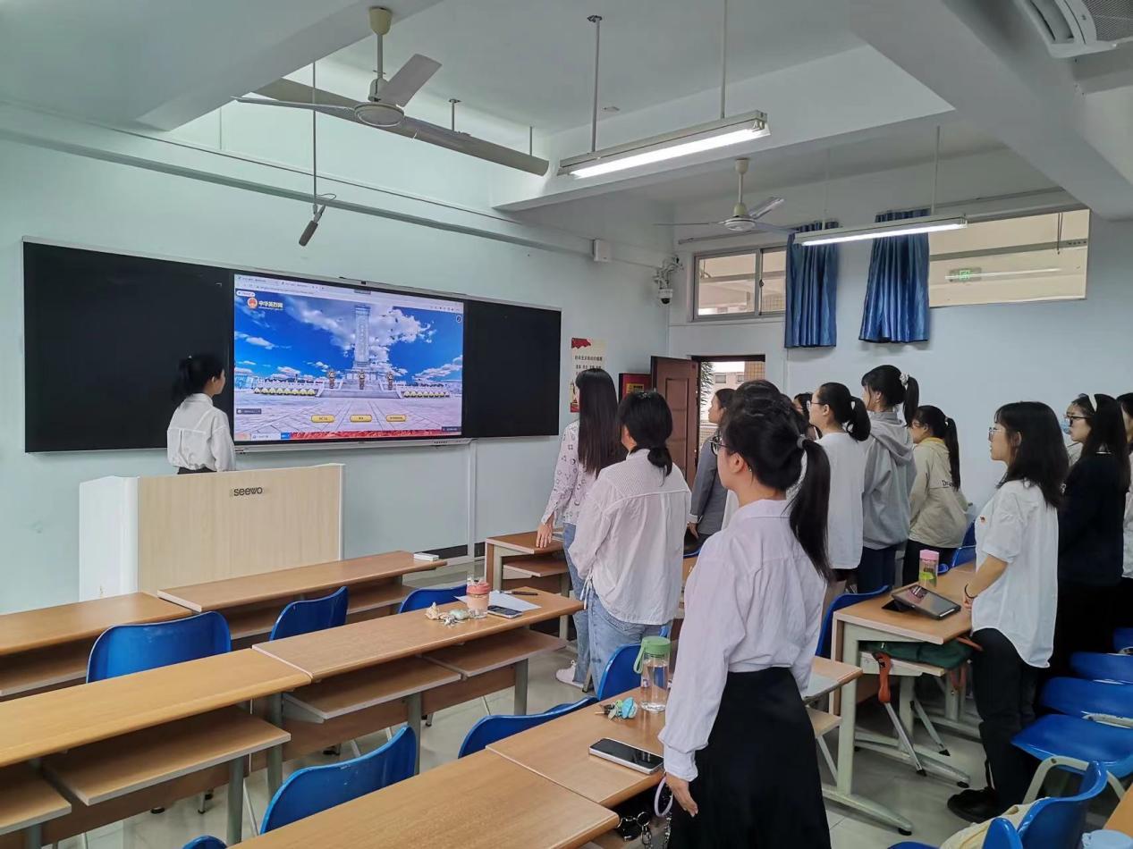 主题党日活动第二个环节为“缅怀革命先烈,传承红色精神”,由学生党员曾阳柳同志主持。活动第一项内容是由党员代表带领参会党员共同学习革命先烈英勇事迹。首先,郭嘉伊同志讲述了赵一曼女士的抗战英雄事迹。赵一曼女士在面对敌人的屠刀时高呼“打倒日本帝国主义”、“中国共产党万岁”的口号,在弥留之际将一封家书留给了儿子,赵一曼是巾帼英雄,是共产主义战士,她的精神不断影响和激励着今天的我们。随后,刘思宇同志分享了杨靖宇将军的抗日英雄事迹,杨靖宇将军凭借常人难以想象的毅力,绝粮数日的情况下,坚持与敌人顽强抗争直到筋疲力尽,其百折不挠、坚韧不拔的信念深深感染着每一个人。接着,曾阳柳同志带领参会党员了解了林心平同志的英雄故事。林心平同志受尽酷刑严守组织秘密,致死一字不吐,她在敌人面前保持了中国共产党人的崇高气节,以坚贞不屈的英雄气概践行了入党誓词,值得我们每一位共产党员学习。最后,林漫菲同志讲述了狼牙山五壮士以身诱敌、临危不惧坚持战斗后英勇跳崖的悲壮故事,呼吁全体党员不忘历史,传承抗战精神,践行先烈们曾用毕生诠释了的真正的英雄精神。活动第二项内容是“网上祭英烈”,与会党员全体起立,在网络献花篮,对先烈进行深切的三鞠躬,并表达无限的敬意。