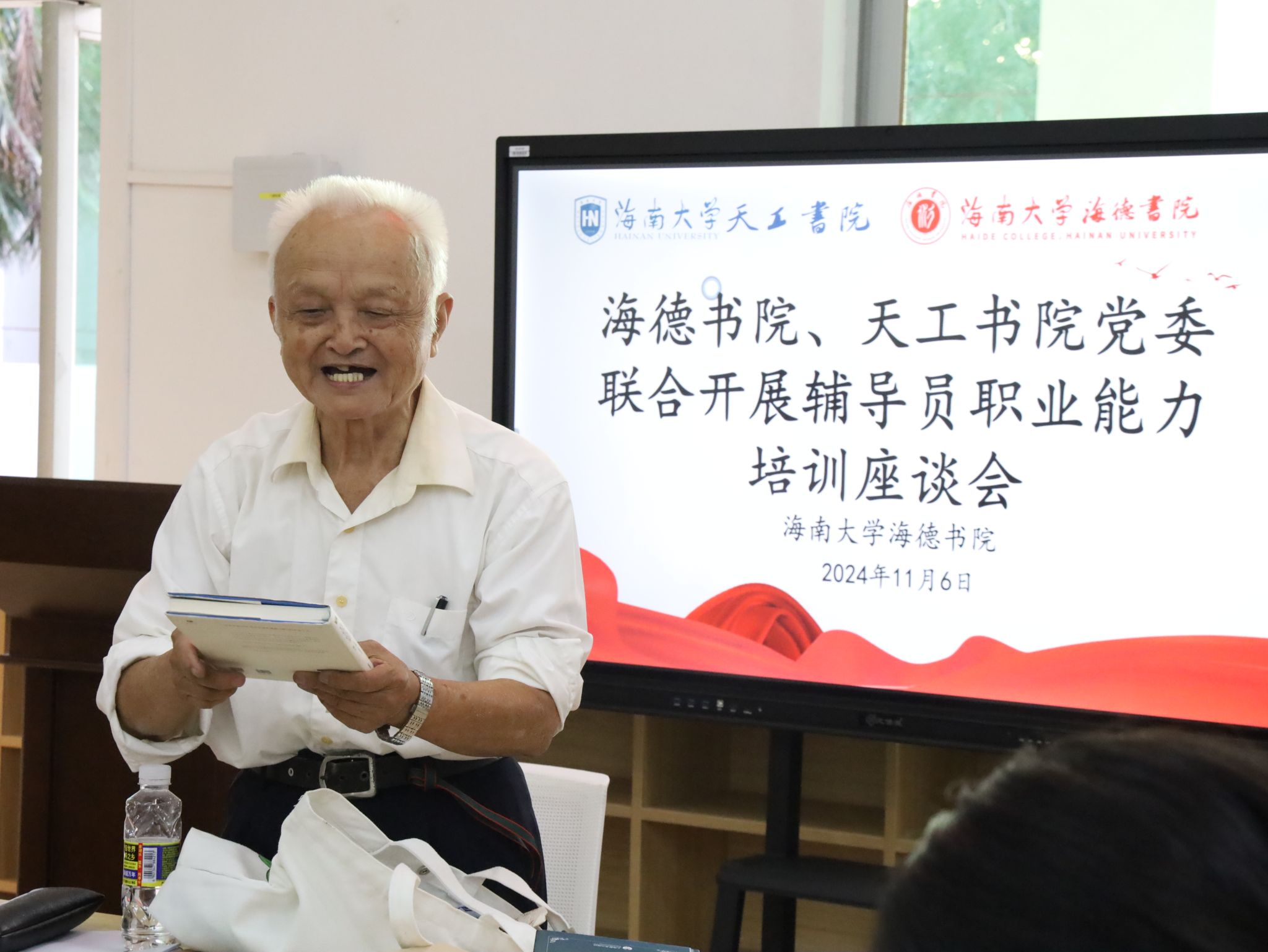 2024年11月6日下午,william威廉中文官网、海德书院在12号学生公寓2楼会议室联合举办辅导员职业能力培训暨工作研究论文的选题与写作研讨会。会议邀请海南大学关工委副主任、《海南大学学报》原主编陈传汉副教授参加并作论文写作培训。海德书院党委书记韩胜丁、william威廉中文官网党委副书记武丹及两院全体在岗辅导员参加活动。