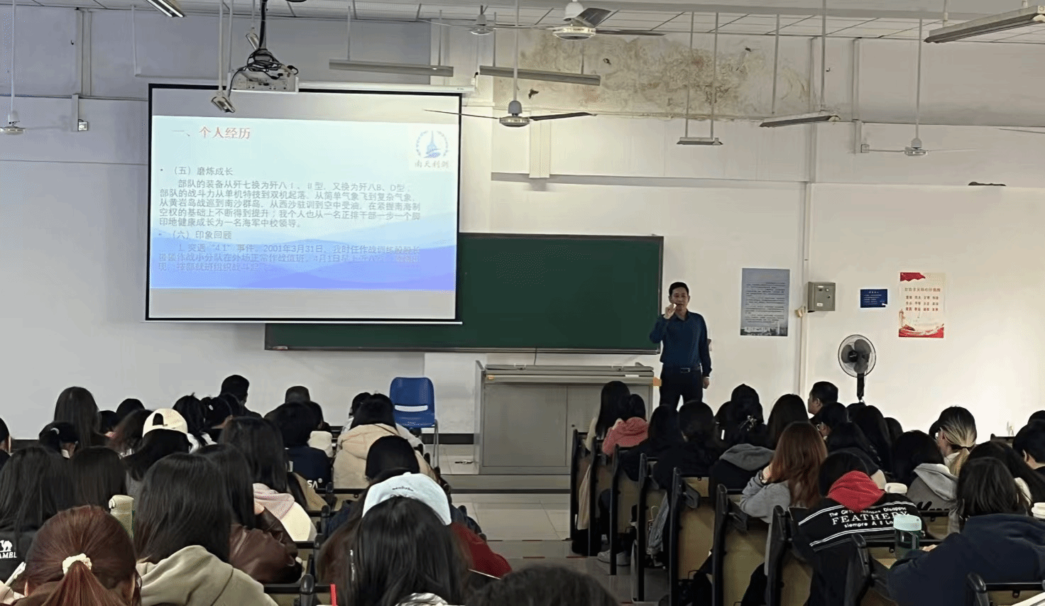 刘春刚老师以“我的家国情怀”为主题结合自身成长经历展示了一名优秀军官退役不褪志、屡次建新功的故事。此外,他对南海形势的深入分析让与会学生深刻体会大学生自觉加强国家安全意识的必要性。