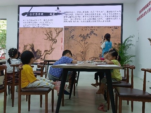 志愿者们用一幅幅绘画作品,一首首诗词歌赋开启了这次绘画课,从多个方面介绍了这样一位多才多艺的北宋诗人,并结合视频,给社区的孩子们详细讲述了东坡先生与海南的渊源及他对海南文化发展的贡献。简单易懂的语言、精美有趣的图片,激起了社区孩子们的兴趣和热情。